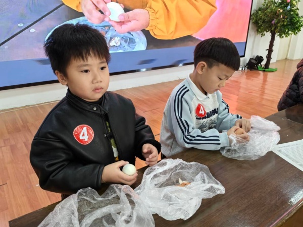最有趣的环节当数“剥鸡蛋大赛”。孩子们神情专注,小手灵活操作,场面既紧张又充满童趣。剥蛋过程不仅考验手眼协调能力,也锻炼了自理能力。现场笑声、加油声不断,气氛热烈。