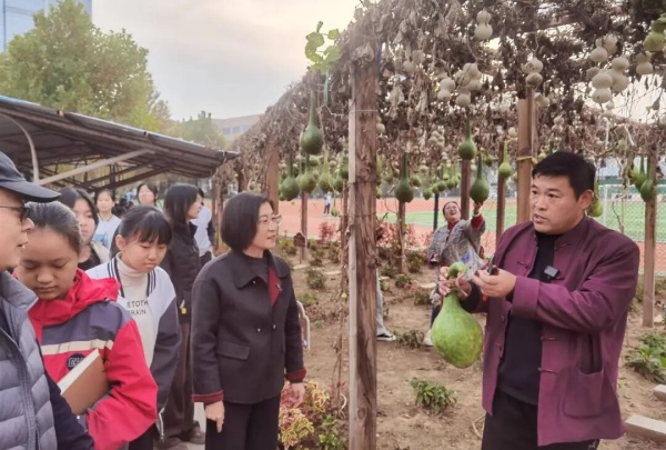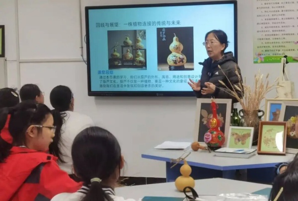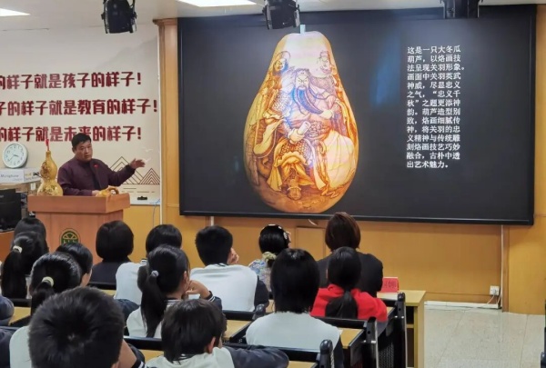 发布仪式后,校外匏艺专家孙正德先生带来专题讲座。从葫芦的种植培育、生长特性,到采摘后的瓜皮晾晒、脱脂处理等关键工艺,再到葫芦雕刻、彩绘等创意延伸方向,孙老师用生动的案例和专业的讲解,为师生与家长勾勒出“从自然生长到美学创作”的完整脉络。干货满满的分享,让大家对这枚小小的葫芦充满了探索欲。