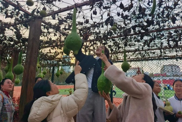 在完成相关理论讲解后,“匏雅轩” 系列课程的实践环节即刻启动。师生与家长一同前往和园,开启葫芦采摘之旅。孙老师现场指导大家如何辨别成熟葫芦、如何留好“龙头”(葫芦顶端的藤蔓),还鼓励孩子们“随形随心创作”,尊重葫芦的自然形态,挖掘其独特的美学价值。亲手摘下沉甸甸的葫芦,孩子们脸上满是收获的喜悦,家长们也纷纷拿起手机记录这难得的亲子实践瞬间。