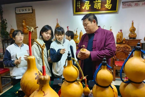 活动的最后一站,是孙正德先生的易葫居个人工作坊。满室的葫芦艺术品令人目不暇接——精美的雕刻作品、绚丽的彩绘葫芦、造型别致的葫芦摆件,每一件都彰显着匠心巧思。孙老师为大家讲解每件作品的创作灵感与工艺难点,让师生和家长们近距离领略了匏艺文化的深厚底蕴。