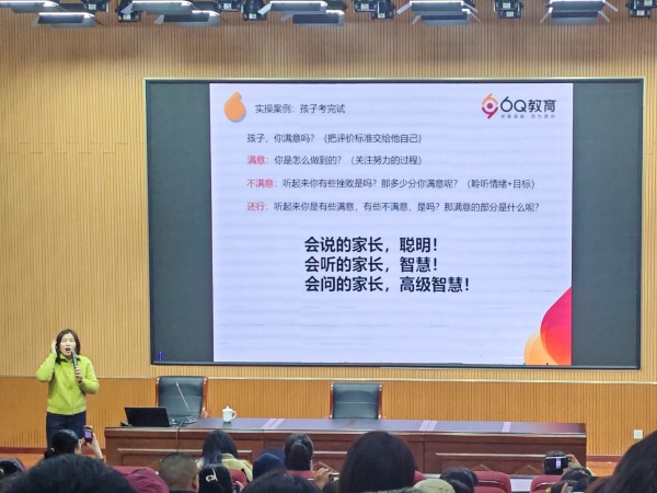 张欣老师给出切实可行的解决方案,指出激发孩子潜能的核心是 “看见其内心需求”,家长需多沟通分享,为孩子补充心理营养:给予孩子正向语言的鼓励;放大孩子目标达成时的内在感受;以快乐体验强化内在动力。讲座现场,张老师还通过实操案例互动,引导家长思考“孩子考完试后的三种沟通方式”,并点明“会说的家长聪明,会听的家长智慧,会问的家长拥有高级智慧”,让家长们在对比中掌握高效沟通的技巧。