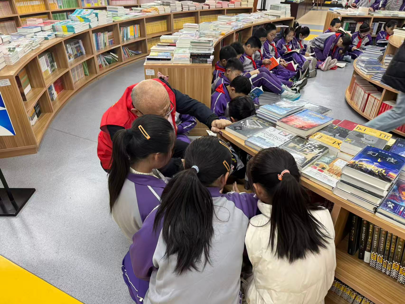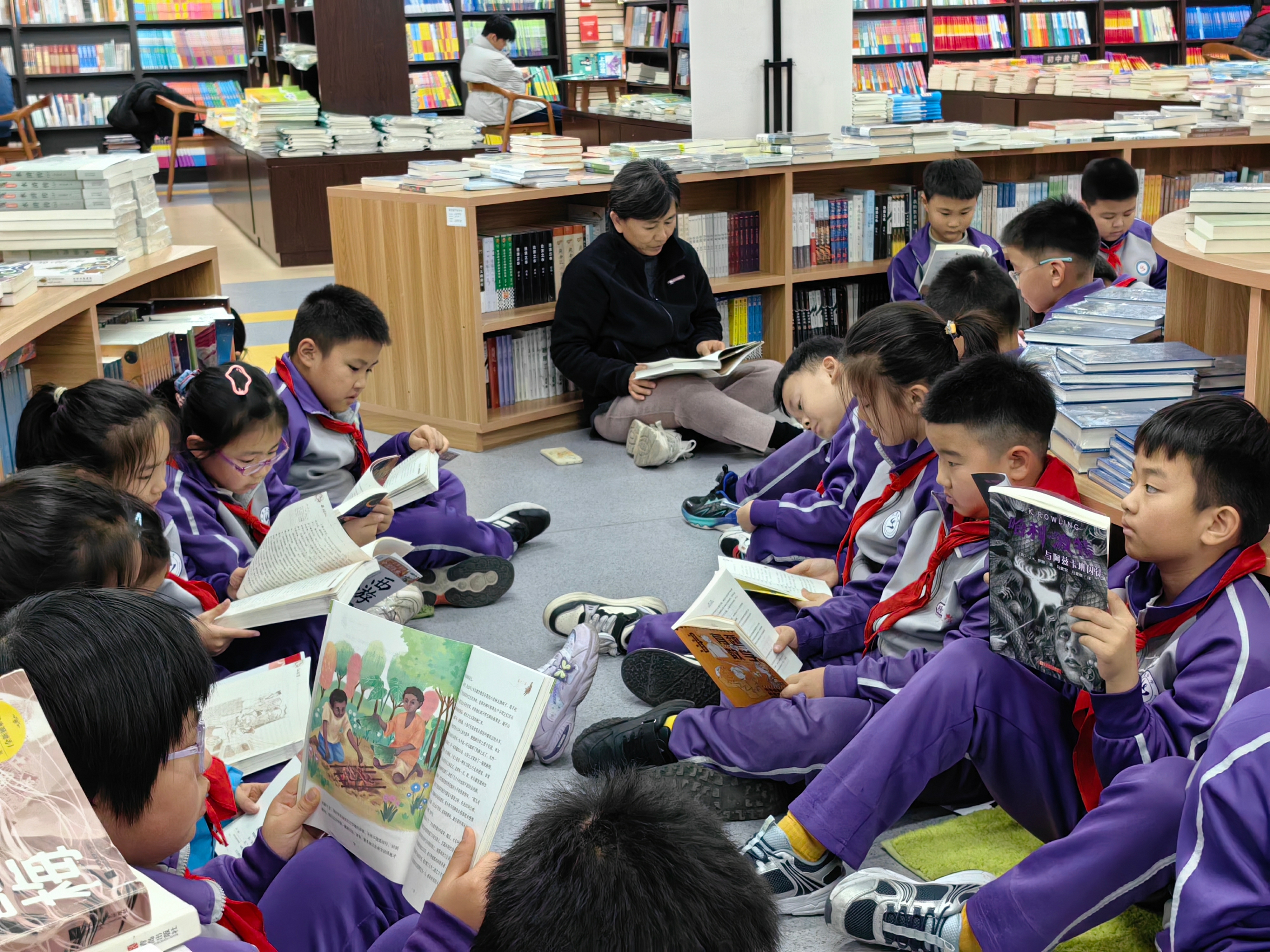 书架上的书籍永远贴着孩子们的成长需求——一年级的拼音绘本、三年级的科普丛书、五年级的名著选读,还有教师精心推荐的“拓展书单”,每一本都精准对接不同学段的阅读目标,破解了家庭阅读中“资源匮乏、选择盲目”的困境。书店里呈现动人的共赴书海的图景:实小老师蹲下身,指着绘本插画给低年级孩子讲解“如何读懂细节”,发挥着学校教育的专业引领作用;家长志愿者组成陪伴团,亲子共读的轻声呢喃让家庭成为阅读习惯养成的重要阵地;书店工作人员微笑递上精心整理的“分级阅读书单”,帮孩子找到适合的读物,用专业服务搭建起资源衔接的桥梁。