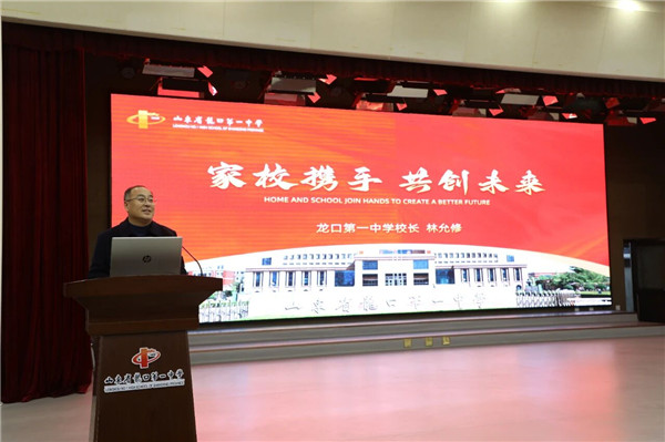 龙口第一中学校长林允修代表学校致欢迎辞,感谢各位委员心系学子成长、情牵学校发展。