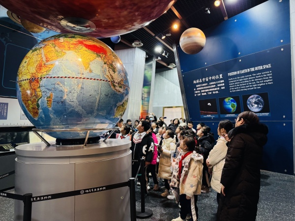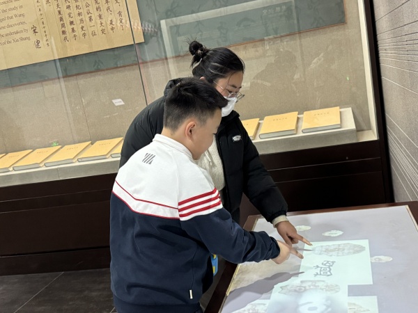 博物馆内,14个主题展厅如同一部部立体的百科全书。在讲解员的带领下,首先来到了地球厅。在这里宇宙的浩瀚、地球的演变,通过精美的模型和生动的解说,变得触手可及。孩子们睁大了好奇的眼睛,认真聆听着,不时发出阵阵惊叹,仿佛在与地球进行一场跨越时空的对话。黄金厅内,孩子们通过巨型山东龙化石与黄金石矩阵,直观理解了“地球生命演化”与“矿产资源形成”的双重脉络。二楼的根雕艺术馆成为本次活动的“人气担当”。艺术家们以树根为笔,将《西游记》《红楼梦》等经典场景雕琢成栩栩如生的立体画卷。四年级学生指着“大闹天宫”根雕惊叹:“孙悟空的筋斗云竟然是用树瘤刻的!”家长王女士则感慨:“这种传统技艺与文学经典的结合比书本上的插图生动百倍。”王懿荣馆内关于甲骨文的精彩介绍让孩子们流连忘返,家长们也仿佛回到了童年,与孩子们一同探索、一同学习,共同感受着自然与人文的交融。
