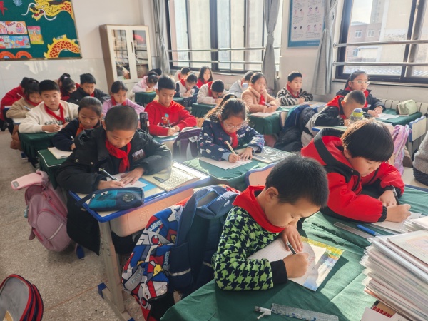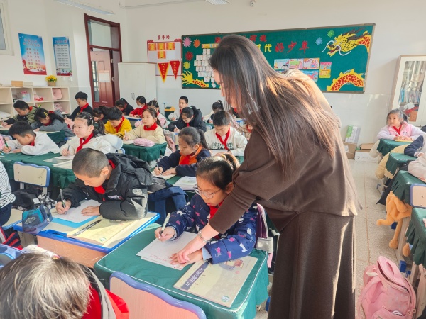 随后,周老师聚焦楷书教学,着重阐释了楷书“形体方正、笔画分明”的核心特点。针对中高年级孩子书写的重点与难点,她将目光锁定在撇画与捺画的练习上,亲手示范起笔、行笔、收笔的关键要领,细致纠正孩子们的握笔姿势与书写动作。孩子们紧随老师的节奏,凝神静气地提笔练习,一笔一画间尽显认真与专注。