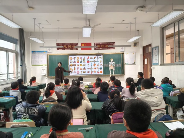 课堂伊始,杨波女士邀请来的好朋友“骨骨”受到了同学们的热烈欢迎。在知识讲解中,“胃像小搅拌机磨碎食物”“心脏是永不疲倦的永动机”,生动的比喻让知识不再枯燥,更让同学们在玩乐中认识了身体器官及其功能;现场“肺活量挑战”更是让孩子们跃跃欲试,在吹气比拼中直观感受肺部功能。