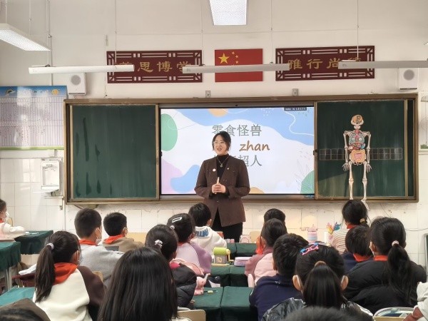 胶东在线12月24日讯(通讯员 张颖 实习编辑 单煜媛)近日,烟台市芝罘区珠玑小学二年级三班开展了一场以“零食怪兽大战健康超人”为主题的家长进课堂活动热闹开展。马浩洋同学家长杨波女士化身“健康老师”,通过趣味互动、游戏体验与生动讲解,将抽象的健康知识转化为孩子们易懂的常识,让课堂成为探索身体奥秘、养成健康习惯的欢乐天地。