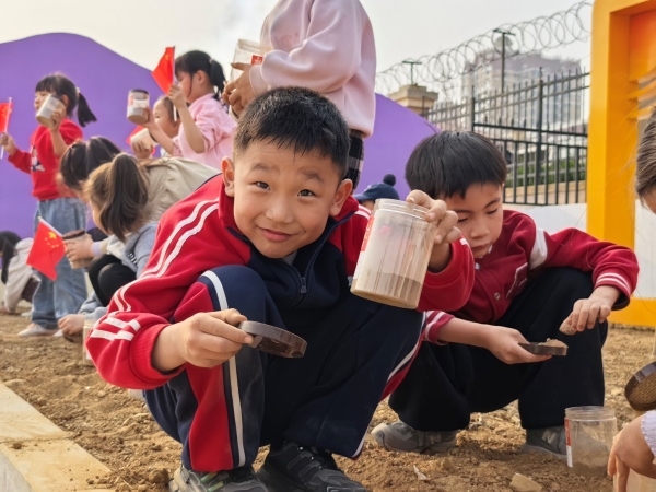 微课堂的温情在“我给祖国写便签”与“取乡土寄深情”的环节中推向高潮。孩子们手握铅笔,一笔一划在便签纸上写下对祖国最纯粹的祝福,歪扭的字迹间流淌着赤子深情;随后,孩子们小心翼翼地捧起故乡泥土,轻轻放入家长精心准备的纪念小杯中。“这杯土里有祖国的味道,我要好好保存它。”一句句稚嫩的呢喃,是孩子与祖国最真挚的情感联结,也让在场的家长们深受触动,深刻体会到家校共育在价值观塑造上的独特力量。