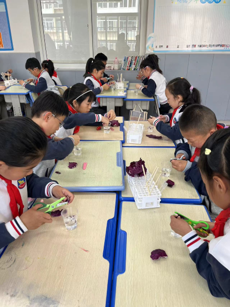 课堂之上,家长志愿者化身为专业的科学老师。他们巧妙运用紫甘蓝、白醋、小苏打等日常常见的材料,为同学们演示了一场奇妙的变色实验。当紫色的汁液与酸相遇,瞬间变为红色;而与碱接触时,则又幻化成蓝色。色彩的瞬息变幻,引得同学们惊叹声此起彼伏。