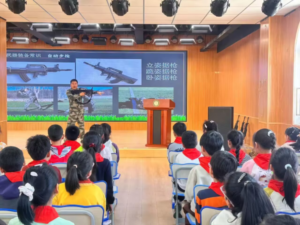 讲座中,王虎带领学生们逐一认识新时代人民军队各军种军旗,详细讲解陆军、海军、空军、火箭军等多支力量军旗的设计理念与精神象征,让学生们直观感受人民军队的使命担当与荣光;同时结合实物科普武器装备常识,以木柄手榴弹为案例,耐心讲解结构原理并现场示范投掷动作,通过实操演示、互动问答等多样形式,把专业的国防知识转化为学生易懂易学的内容,让国防教育真正入脑入心。整场讲座充分发挥家长专业优势,打破了校园课堂的教学局限,实现了家校教育资源的有效互补。