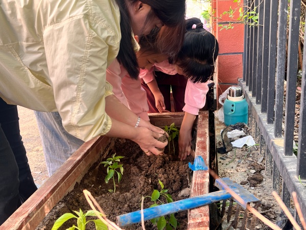 活动现场,家长化身“自然老师”,耐心讲解辣椒种植的小知识:从翻土、扶苗、覆土到给苗浇水,每一个步骤都细致演示。孩子们围在一旁,睁着好奇的眼睛认真观察,小手跃跃欲试。在家长的引导下,大家小心翼翼地捧着辣椒苗,轻轻放进松软的泥土里,再用小手把土压实,认真的模样仿佛在守护一件珍贵的宝贝。